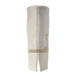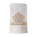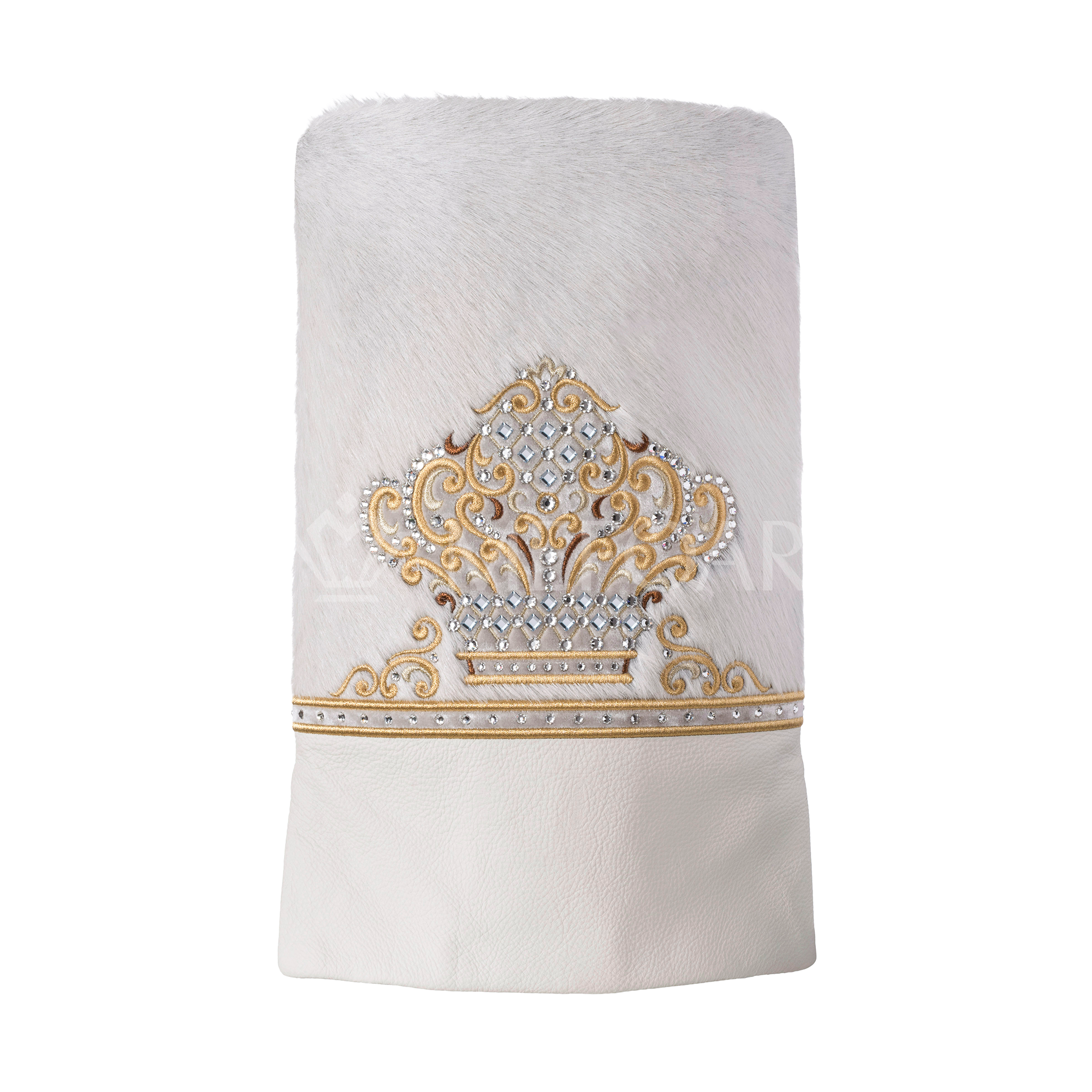 Our stunning white mantle features genuine white fur and leather; it is decorated with a golden embroidered crown, and embellished with Swarovski crystals.