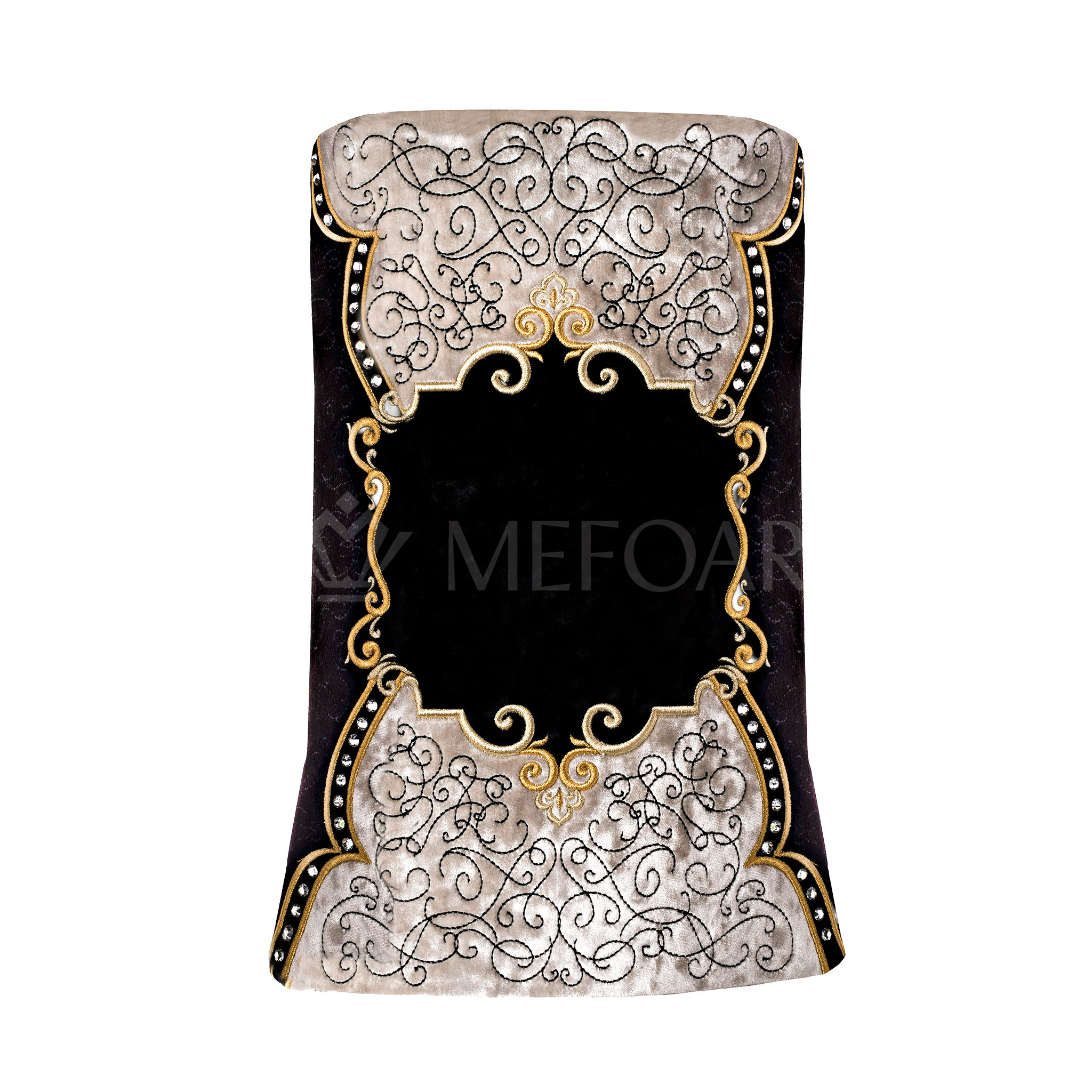 Our Classic mantle features a rich velvet; it is decorated with silver and Black embroidery, and embellished with Swarovski crystals.