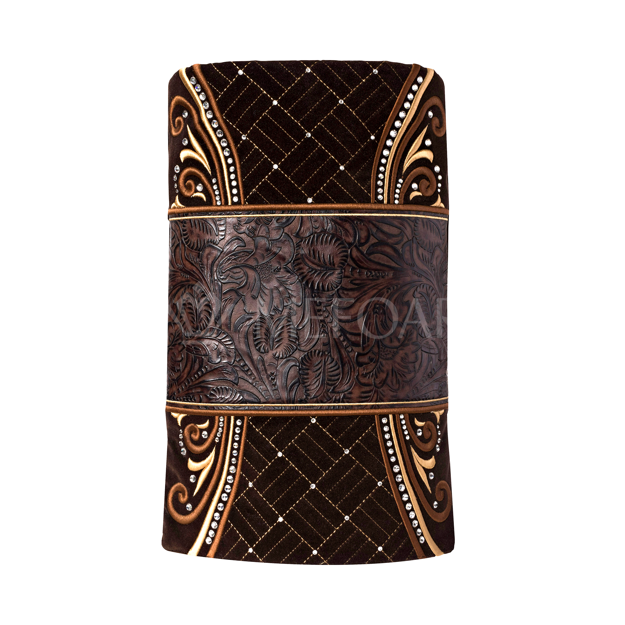 Our Classic mantle features a rich Velvet and Leather; it is decorated with Gold embroidery, and embellished with Swarovski crystals.