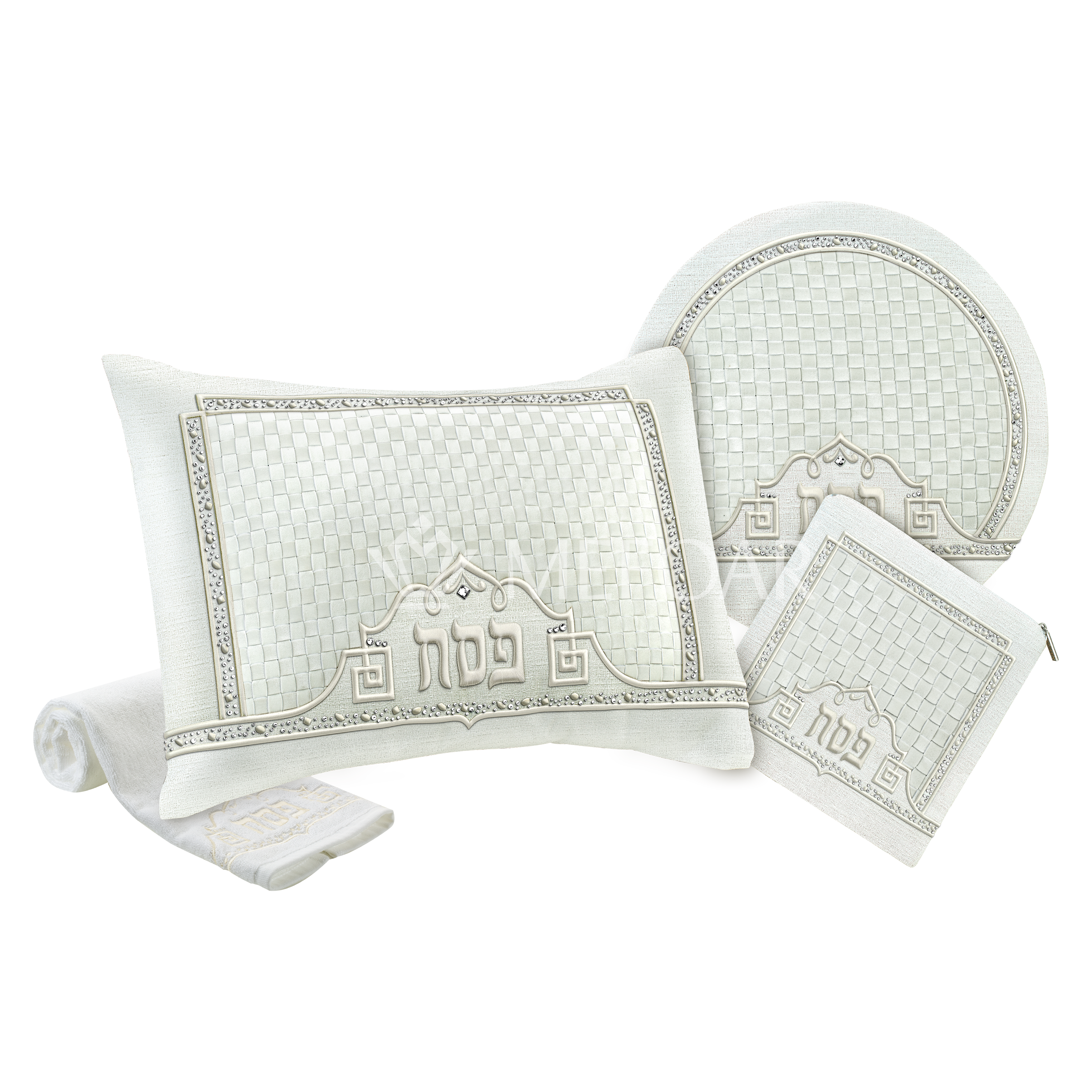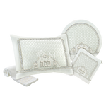 Our 4-piece Pesach Seder Set is designed to elevate your holiday celebration. Each set includes a beautifully crafted pillow, matzah cover, afikomen bag, and towel. Plastic for the pillow and matzah cover is included.